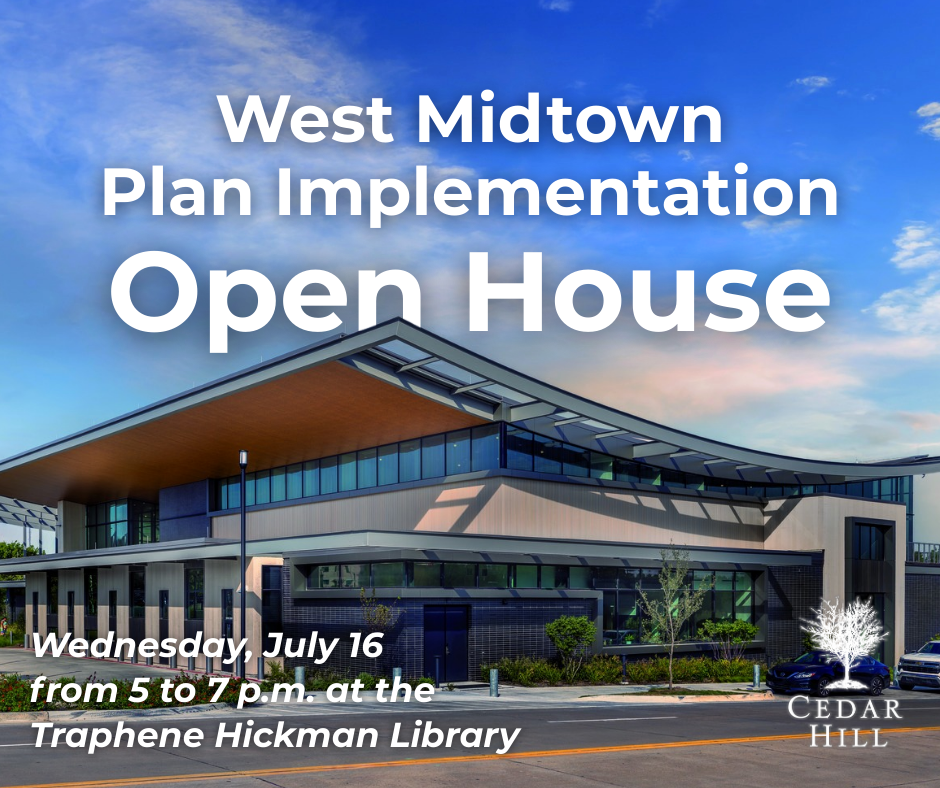 This event is on Wednesday, July 16 from 5 to 7 p.m. at the Traphene Hickman Library, 450 Pioneer Trail, Cedar Hill, Texas 75104. For more details on the master plan, please visit: https://cedarhilltx.com/3022/West-Midtown-Master-Plan