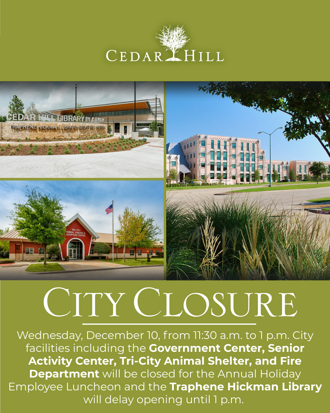 Wednesday, December 10, from 11:30 a.m. to 1 p.m. City facilities including the Government Center, Senior Activity Center, and Tri-City Animal Shelter will be closed for the Annual Holiday Employee Luncheon.