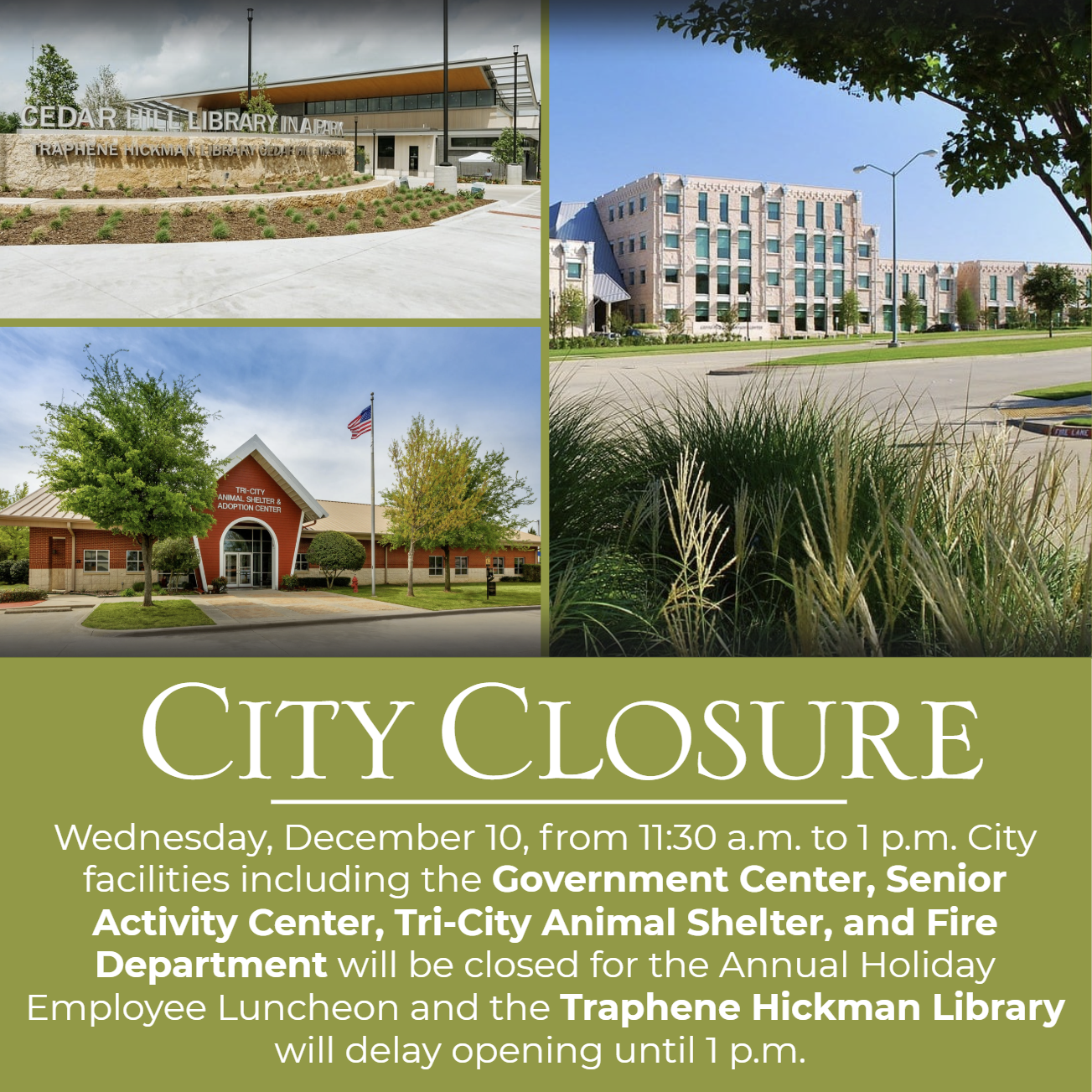 Wednesday, December 10, from 11:30 a.m. to 1 p.m. City facilities including the Government Center, Senior Activity Center, and Tri-City Animal Shelter will be closed for the Annual Holiday Employee Luncheon.